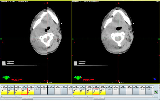 La imagen de la izquierda muestra que no hay coincidencia entre la TAC de planificación (mitad izquierda) y la TAC obtenida inmediatamente antes del tratamiento (mitad derecha). La coincidencia de las 2 imágenes se logra moviendo el paciente robóticamente hasta que las 2 imágenes se superpongan perfectamente como se ve en la imagen de la derecha.