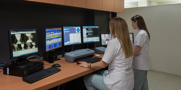 Consola de mando de nuestro equipo Varian, se muestra la complejidad del proceso de administración de los tratamientos radiantes. Significa una gran responsabilidad, concentración y conocimiento por parte de los técnicos radiólogos.